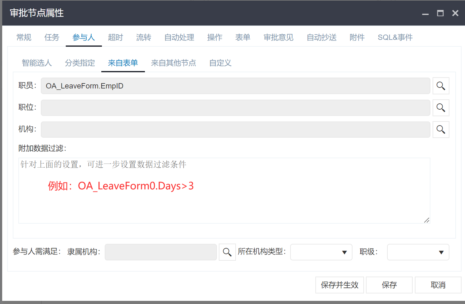 - 10.流程设计,节点属性,参与人来自表单时,可设置附加过滤条件,进一步过滤数据