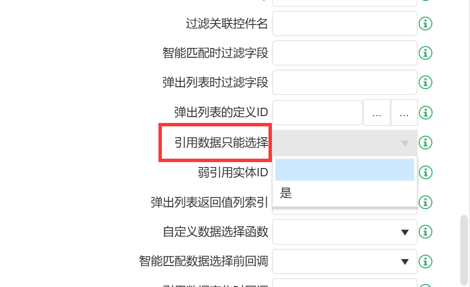 - 2.表单设置,表单属性,增加“引用数据只能选择”,设置引用数据是否只能弹框选择,不能输入智能匹配