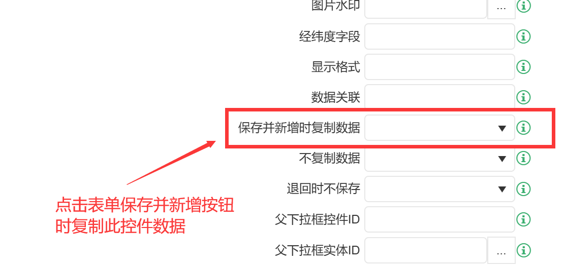- 3.表单设置,表单属性,增加“保存并新增时复制数据”,设置是否点击“保存并新增”按钮时复制控件数据到新的表单上
