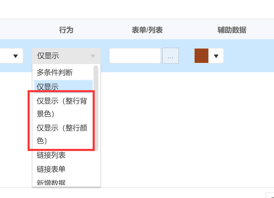 - 12.列表列高级绑定,“行为”增加“仅显示(整行背景色)”和“仅显示(整行颜色)”