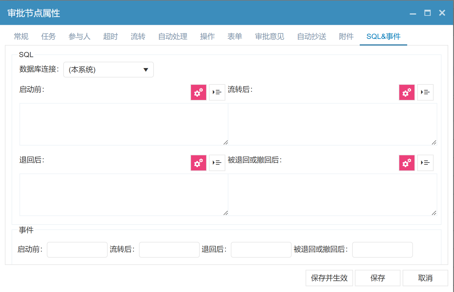 - 18.流程节点的“SQL&事件”增加到4种:启动前,流转后,退回后,被退回或撤回
