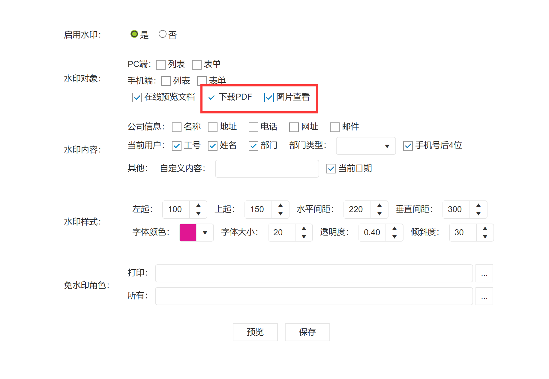 - 25.水印管理,水印对象,增加“下载PDF”和“图片查看”,可设置下载PDF文档或图片加载(下载)时是否自动添加水印